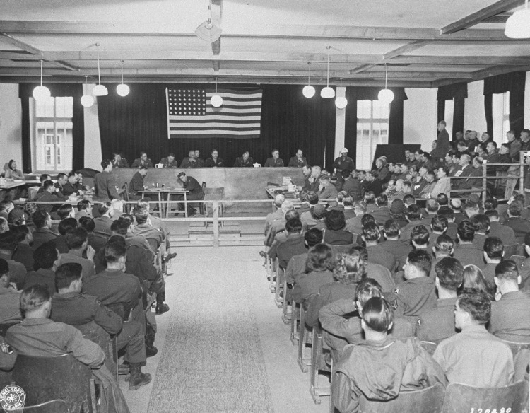 Miller, The courtroom at Dachau during the trial of former camp personnel and prisoners from the Dachau concentration camp, 04.12.1945, United States Holocaust Memorial Museum #82891, courtesy of National Archives and Records Administration, College Park, public domain, online verfügbar: collections.ushmm.org.