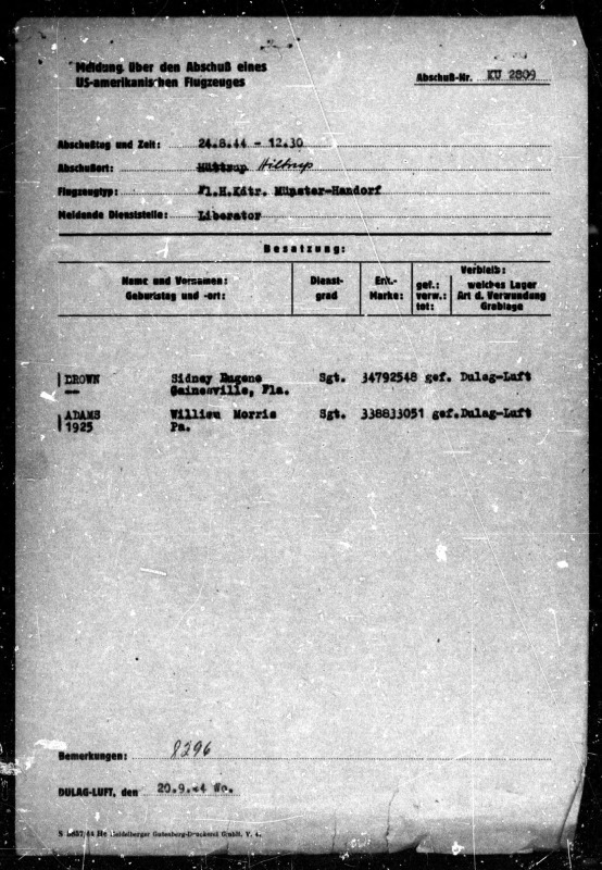 Ein im Dulag Luft ausgefüllter Meldebogen über den Abschuss eines US-amerikanischen Flugzeugs listet die inhaftierten Besatzungsmitglieder Sidney Eugene Brown und William Adams auf, 20.09.1944.