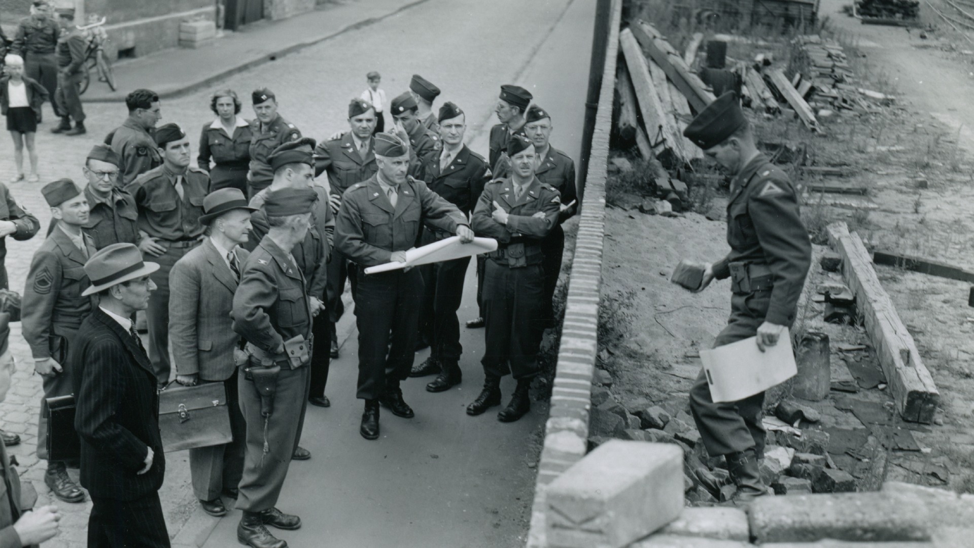 Autor:in unbekannt, Ermittlungen durch die amerikanische Untersuchungskommission am Tatort in Rüsselsheim, 1945, National Archives/NARA RG 111, Records of the Office of the Chief Signal Officer, Foto 328144, (Faksimile Stadtarchiv Rüsselsheim).