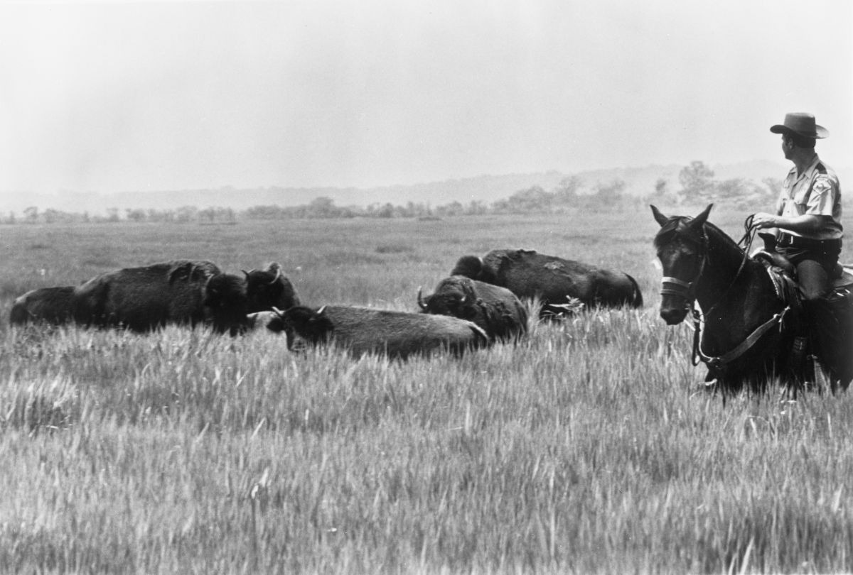 Autor:in unbekannt, Park ranger, Paul Crawford, inspecting bison at Paynes Prairie Preserve State Park, Alachua County, Florida, ca. 1971, State Archives of Florida, Florida Memory, public domain, online verfügbar: floridamemory.com.