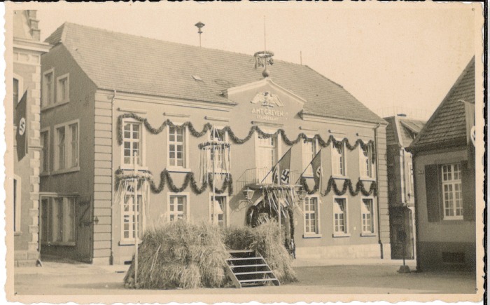 Das Grevener Rathaus mit Hakenkreuzbeflaggung, 1936/37.