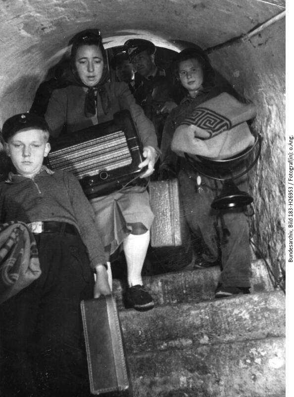 Berliner:innen beim Aufsuchen eines Luftschutzkellers, 8. April 1944.