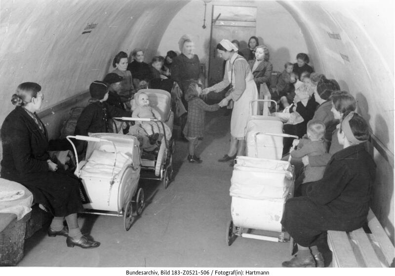 Im Luftschutzstollen für Frauen mit Kindern, ca. 1942.