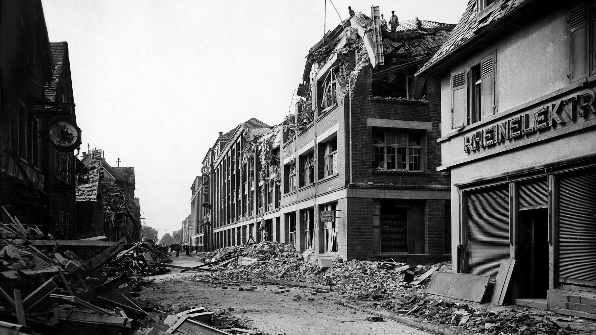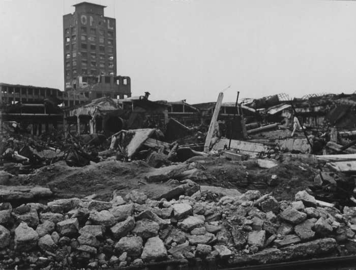 Nach dem Luftangriff auf Rüsselsheim am 20. Juli 1944 ist am größten Metallpresswerk Deutschlands vom Schriftzug „OPEL“ nur noch „OIL“ sichtbar.