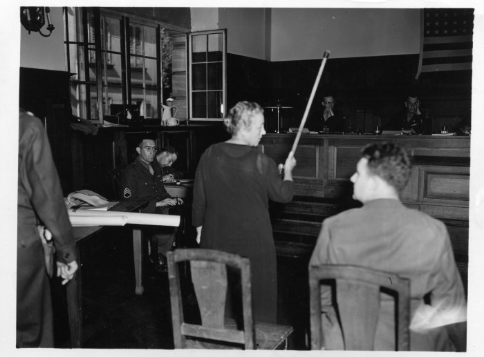 Eine Zeugin der Anklage demonstriert Schläge vor dem amerikanischen Militärgericht in Darmstadt, 25. Juli 1945.