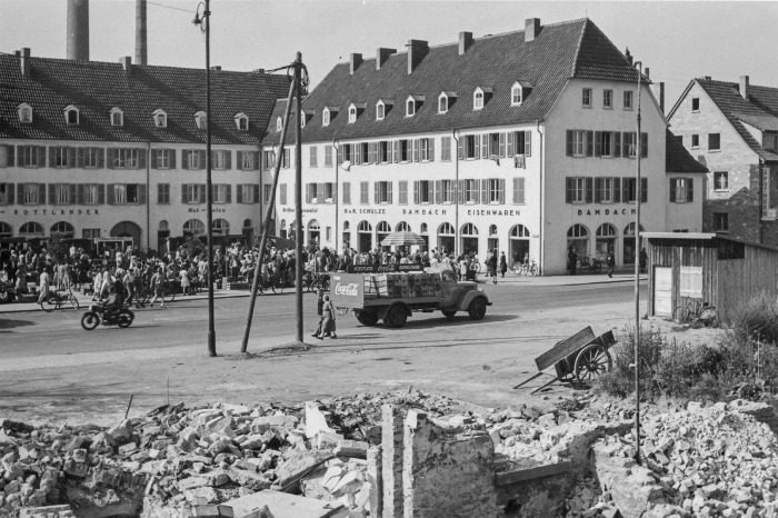 Der Marktplatz in Rüsselsheim während des Wiederaufbaus in der Nachkriegszeit.