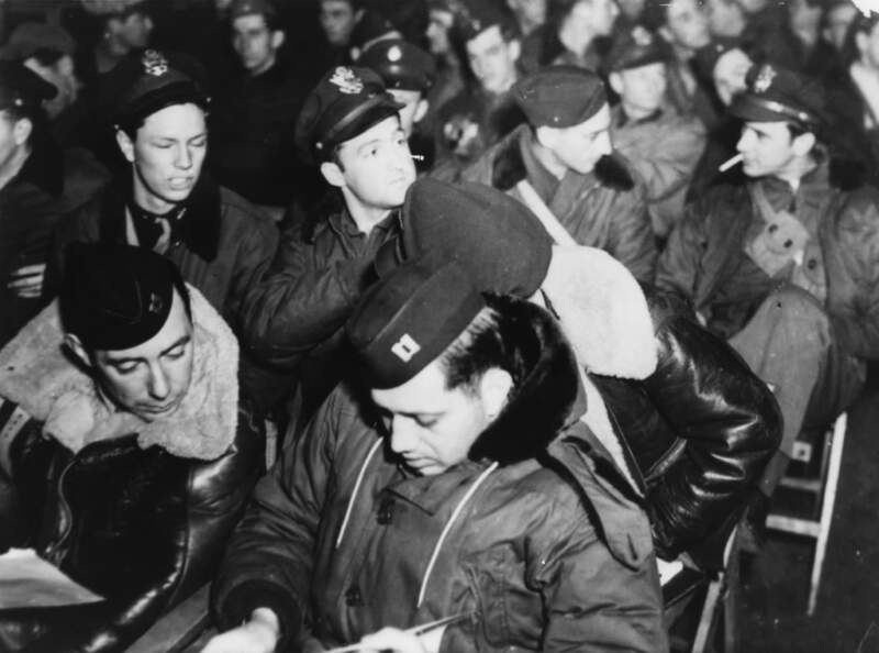 Autor:in unbekannt, Briefing der 491 st. Bomb Group vor dem Einsatz in Hamburg, American Air Museum, Imperial War Museums, Object number: FRE 2105, CC BY-NC 3.0, online verfügbar: americanairmuseum.com.